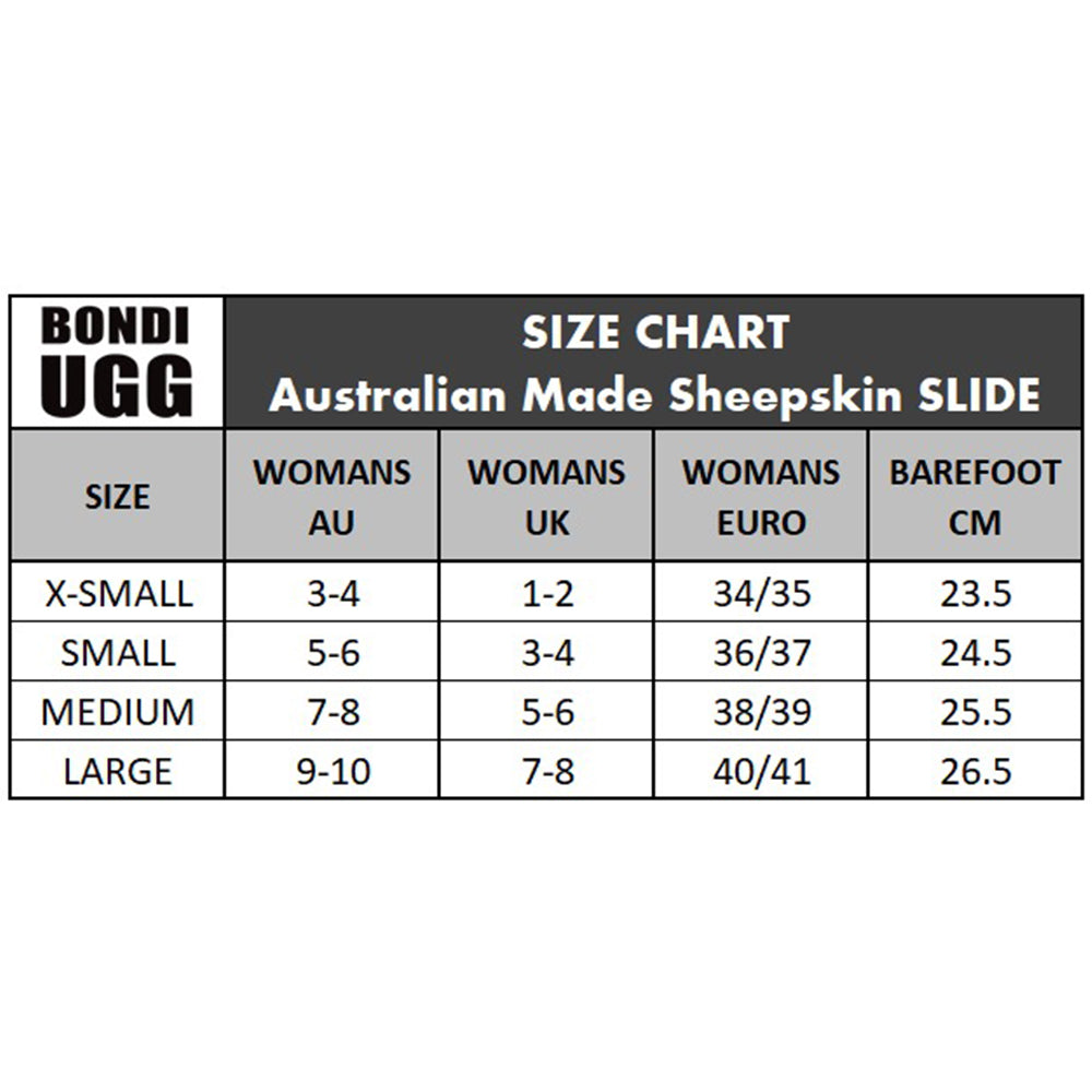 On trend, hand crafted and 'Australian Made ' - the BONDI UGG  super soft sheepskin slides are a perfect staple for your shoe wardrobe. This fun, lightweight slip on slide is suitable for any time of the year.  Whether you are looking for a slip on sandal to wear out and about or a casual slip on to wear around home you will love the comfort and luxurious feel of our classic slide.